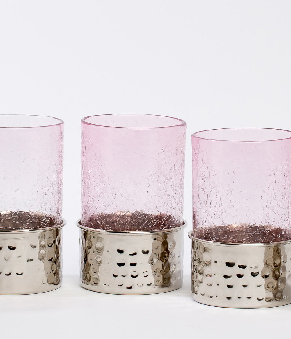 Cette élégante carafe en verre soufflé craquelé et ses verres à eau avec un support en cuivre martelé apportera fraîcheur et originalité à votre table.