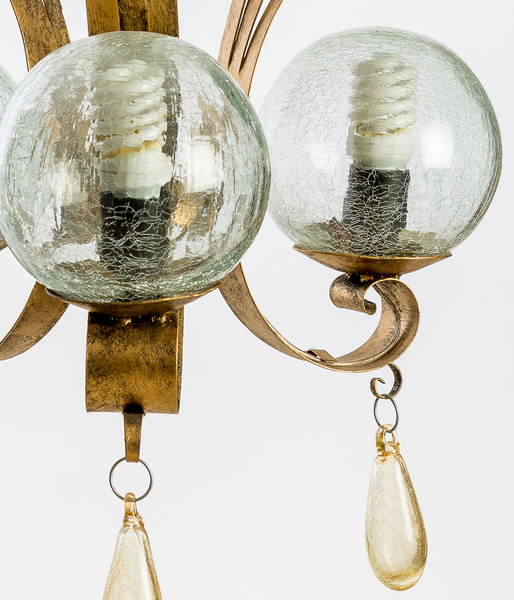 Lustre composé de 3 boules en verre soufflé transparent posées sur 3 bras, le tout placé sur un support en fer forgé doré.